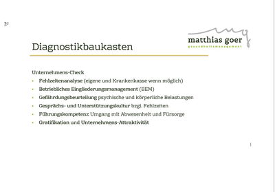 Unternehmenscheck: Differenzierte Fehlzeitenanalyse, psychische Gefährdungsanalyse, BEM, Führungsverhalten bzgl. Abwesenheit ...